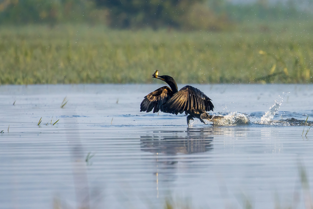 An Indian Cormorant was very excited with its catch and broke away from a pack to savor the meal alone.